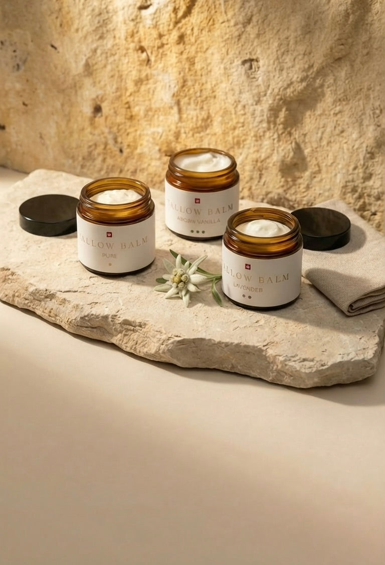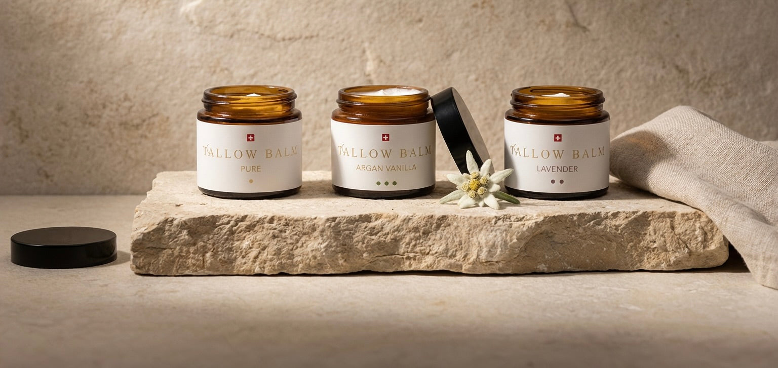 Swiss Tallow steht für natürliche Hautpflege, die wirkt – puristisch, ehrlich und tiefpflegend. Unsere Hautpflege - Produkte basieren allesamt auf Tallow, gewonnen aus Rindertalg von artgerecht gehaltenen Schweizer Weiderindern. Aber warum Tallow? Nun, weil es der menschlichen Haut in seiner Struktur so ähnlich ist, dass es tiefenpflegend in die Haut einzieht und diese so auf natürliche Weise die Regeneration unterstützt und schützt. Und dank unserer leichten, luftigen und vor allem zarten Textur bietet Swiss Tallow für unreine Haut Pflege, die die Poren nicht verstopft, sondern sich den empfindlichen Hautpartien sanft und wohltuend anschmiegt. Weil Tallow so vielfältig hilft, bieten wir dir in unserem Shop ein innovatives Hautpflege - Sortiment mit einer vielseitigen Auswahl an Tallow Balms – ob pur, mit hautberuhigendem Lavendel, pflegendem Jojoba oder schützendem Tallow Sun. Und für Liebhaber exklusiver Naturkosmetik haben wir zudem unsere luxuriöse Kollektion entwickelt: Tallow mit den neuen Varianten Orange, Vanille Jojoba oder Vanille Argan.